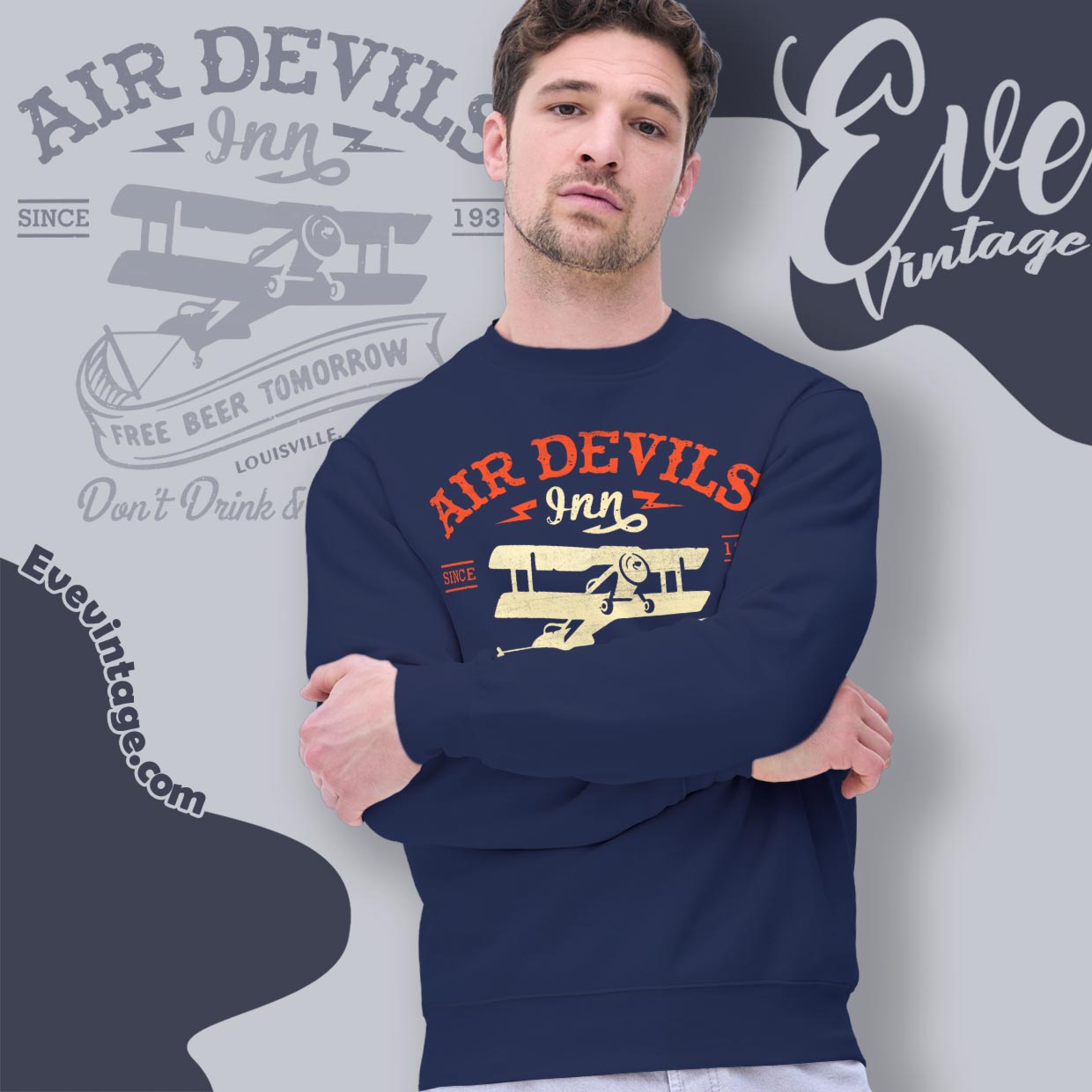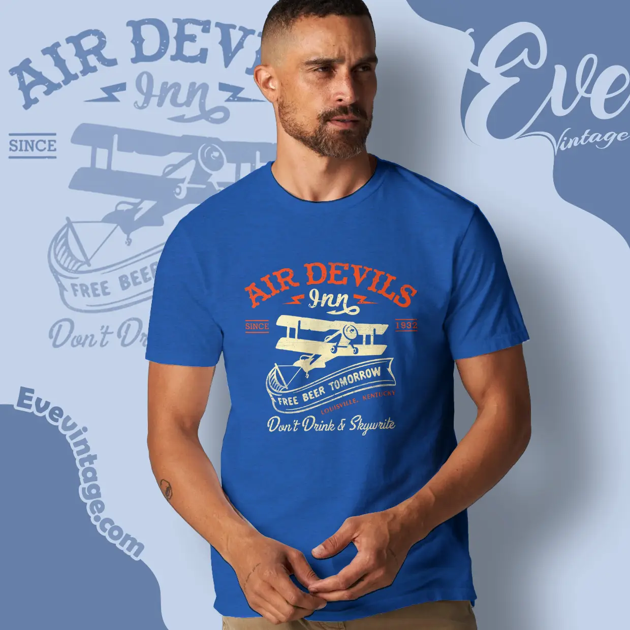 The Air Devil’s Inn Shirt takes inspiration from early aviation culture and classic dive-bar humor. The vintage biplane illustration, distressed lettering, and muted military tones give the design a pre-war Americana feel. With playful slogans and a bold “since 1932” callout, the graphic reads like an old tavern sign made for pilots, mechanics, and night owls who never quite landed early.