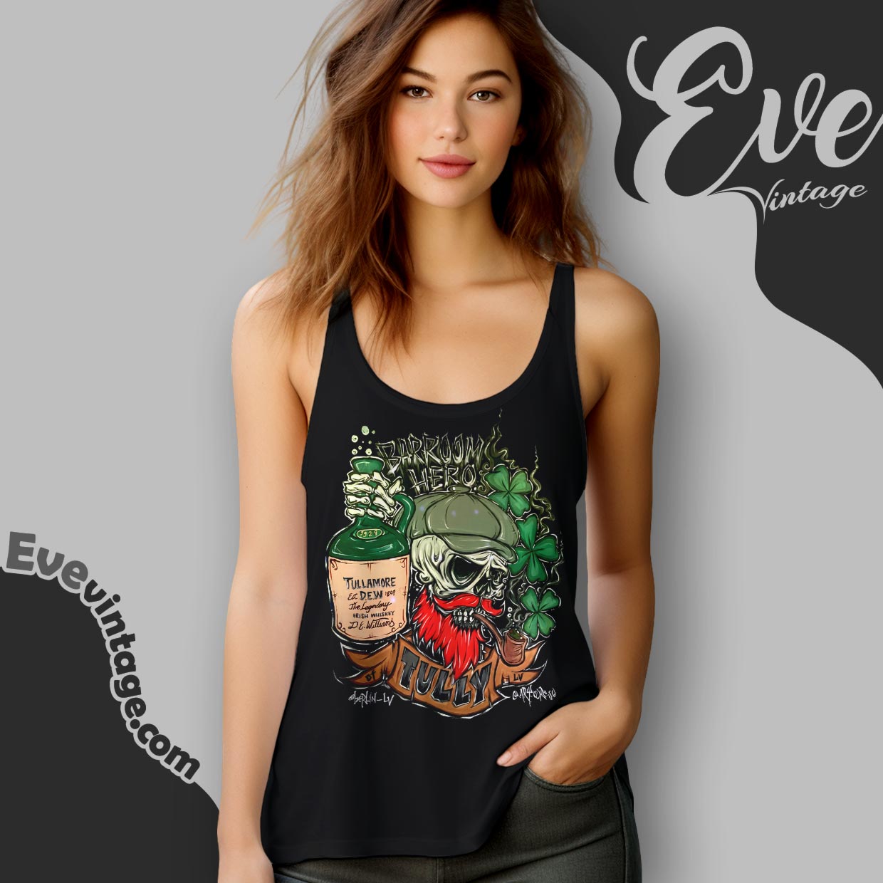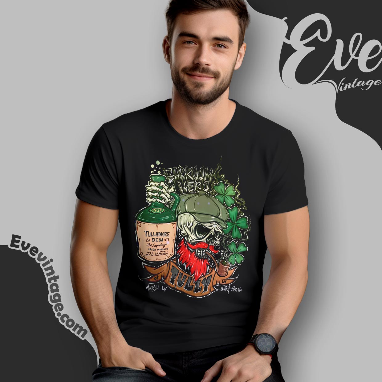This Berlin Bar LV Shirt – Barroom Hero Tully is driven by character rather than decoration. The graphic centers on a skull-faced figure with a flat cap, red beard, clover, and a raised bottle—imagery pulled straight from Irish pub folklore and late-night bar legends. The hand-drawn style, heavy outlines, and dark palette give the shirt a raw, underground feel, closer to a wall mural or sticker behind the bar than a clean commercial logo. It’s designed to signal attitude, not branding.