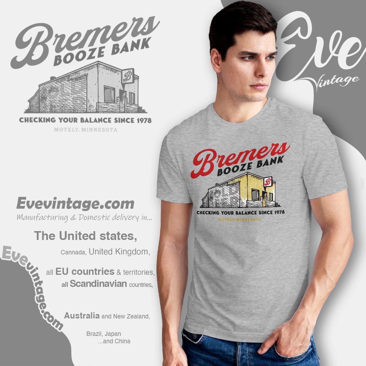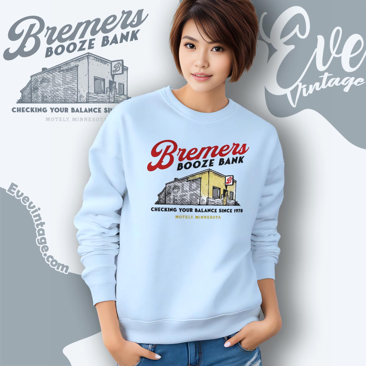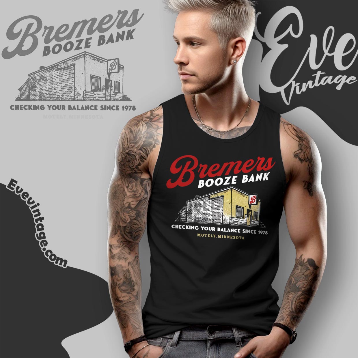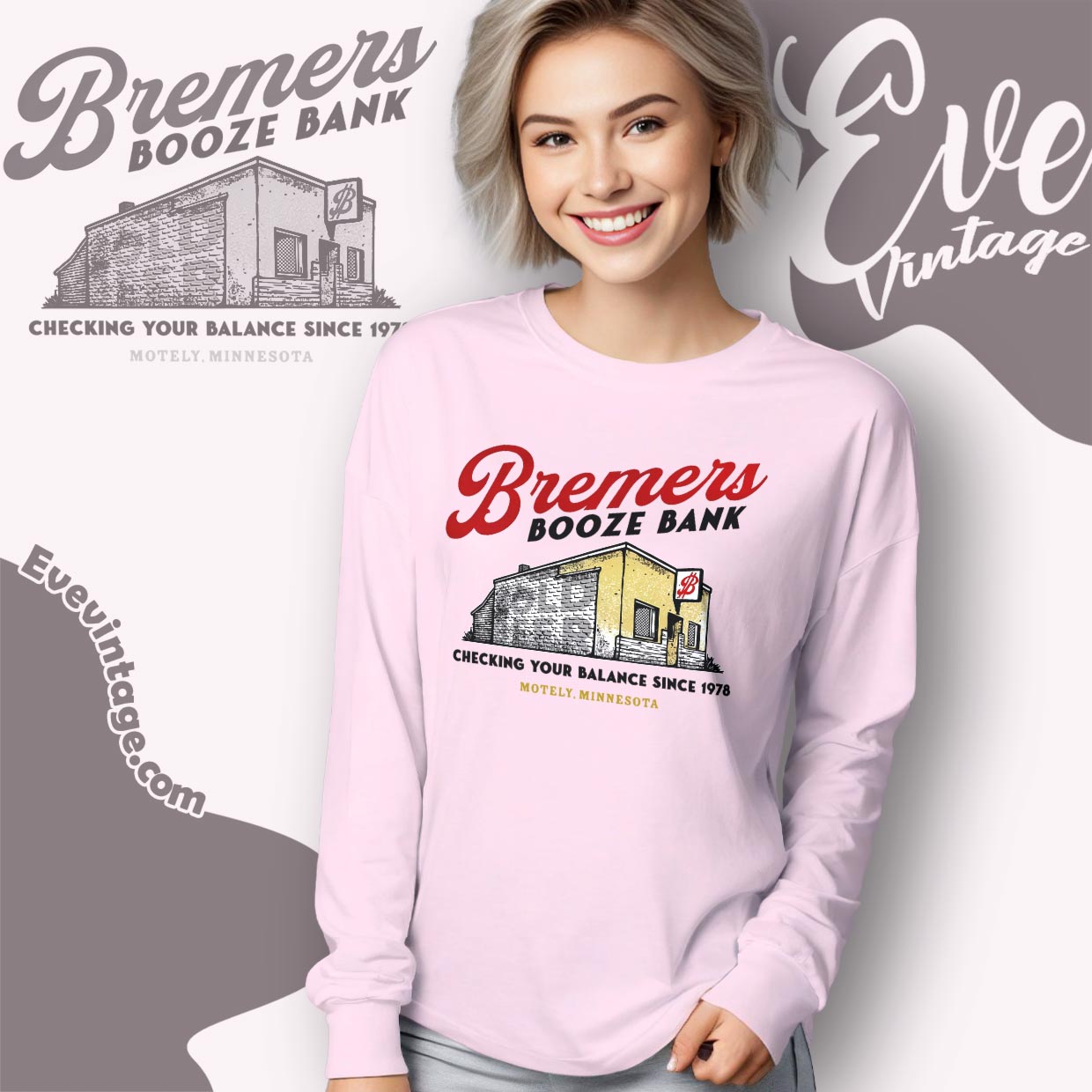 Related keywords: Bremer’s Booze Bank shirt, Motley Minnesota dive bar tee, small town Minnesota tavern apparel, vintage bar sign graphic tee