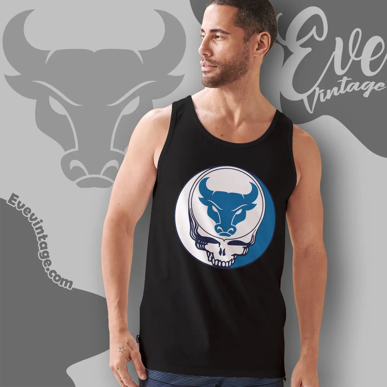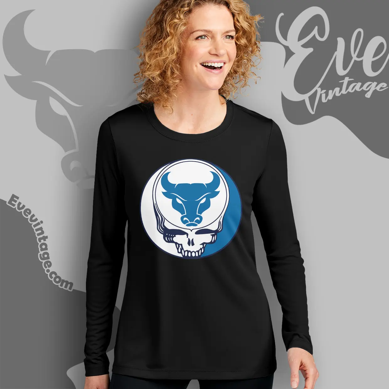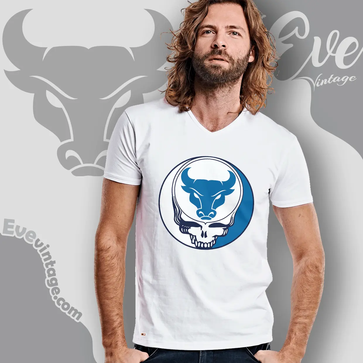 The image printed on this shirt creatively merges the University at Buffalo’s well-known bull head emblem with the legendary “Steal Your Face” skull design, pairing collegiate tradition with rock culture flair. The blue bull’s head is set prominently within the circular frame of the skull, symbolizing tenacity and resilience. This clever fusion celebrates both the fierce athletic spirit of the Buffalo Bulls and the timeless appeal of the Steal Your Face iconography, making it a unique tribute for students, alumni, and fans alike.