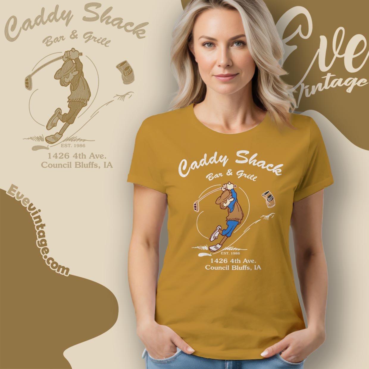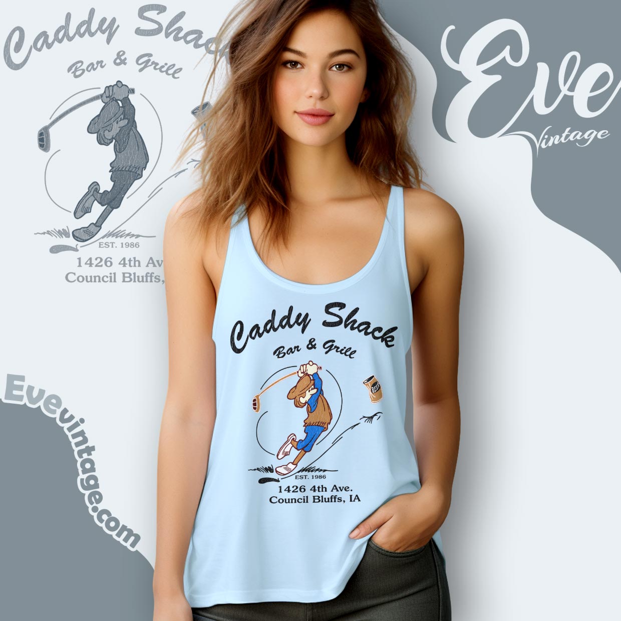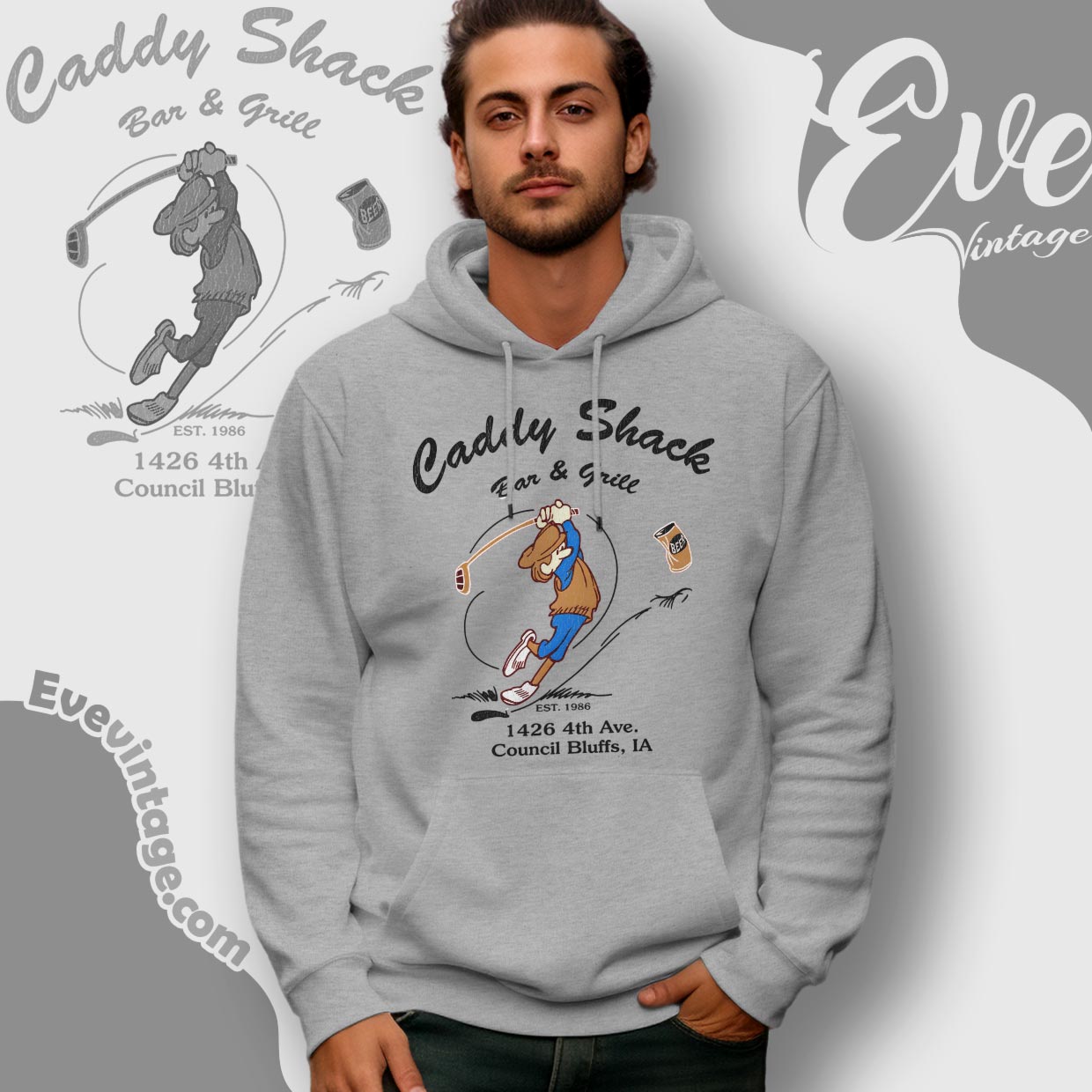 Caddy Shack Bar & Grill is located in Council Bluffs, Iowa, with 1986 commonly referenced as its starting point. The address shown on the design—1426 4th Ave.—places it firmly within a working-class part of town, reinforcing its identity as a true local hangout rather than a destination venue.