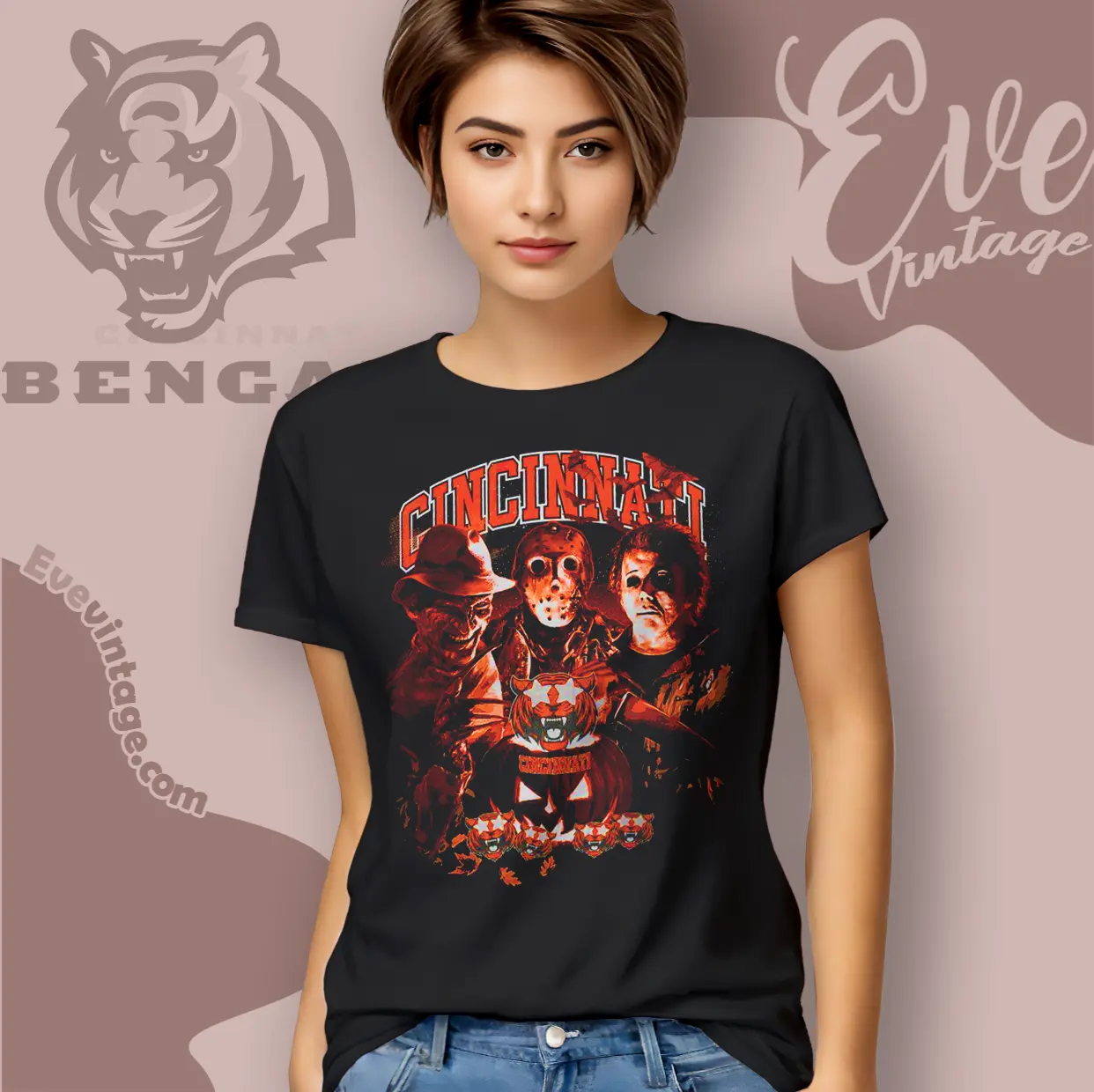 Related keywords: Cincinnati Bengals Halloween shirt; Bengals horror graphic tee; Cincinnati Bengals spooky football shirt; orange and black Bengals Halloween fan shirt