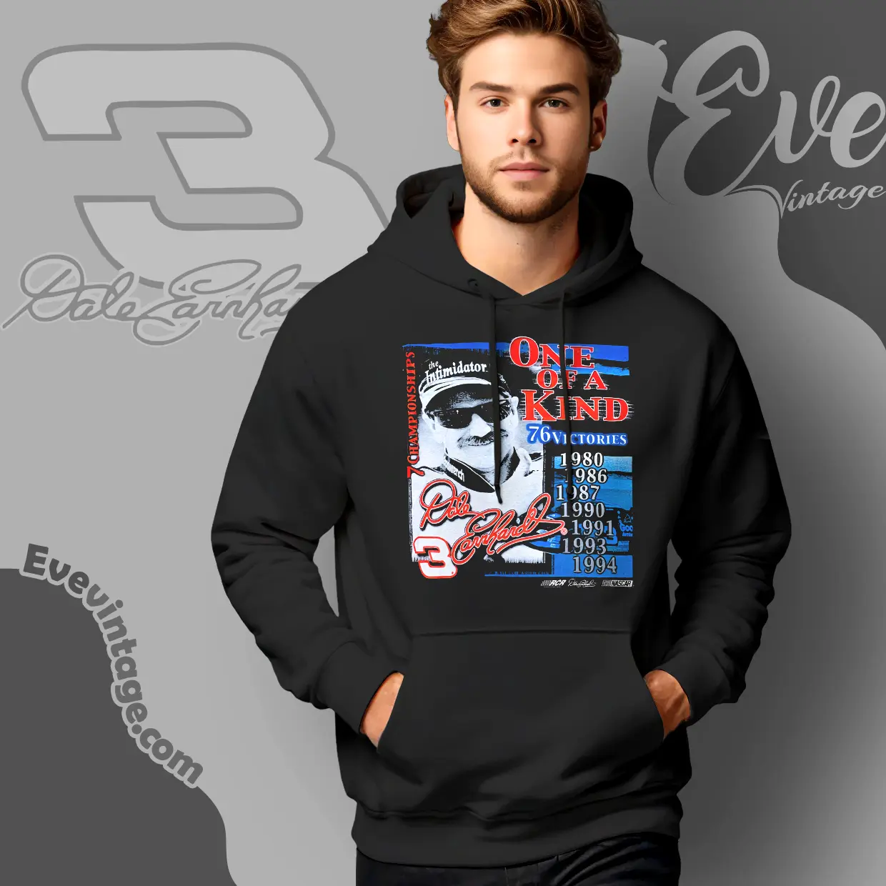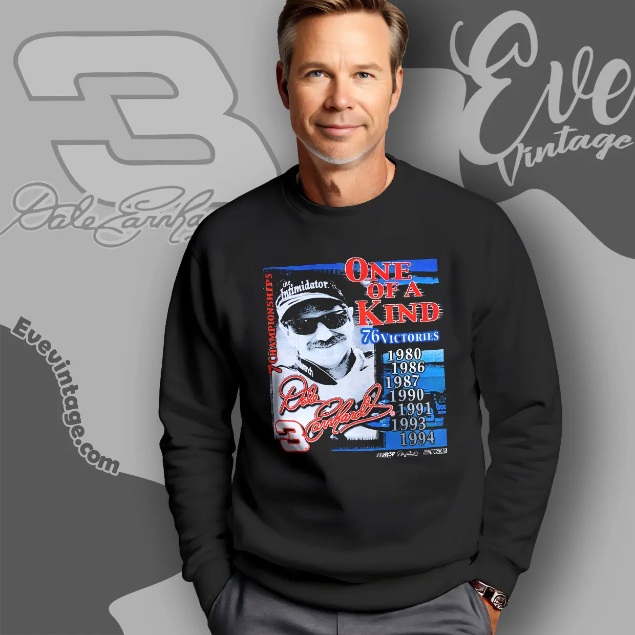 The design centers on a striking black-and-white portrait of Dale Earnhardt wearing his famous “Intimidator” cap and sunglasses, capturing his fierce competitive spirit. Bold red, white, and blue elements frame the artwork, emphasizing his American racing heritage. The graphic proudly displays “One of a Kind” alongside stats that celebrate his 76 victories and seven championships from 1980 to 1994, including the years he dominated the track. The number 3—a symbol synonymous with Earnhardt—is boldly placed to evoke the classic racing jersey look that fans instantly recognize. This dynamic artwork pays tribute to his fearless style and enduring influence on NASCAR history.