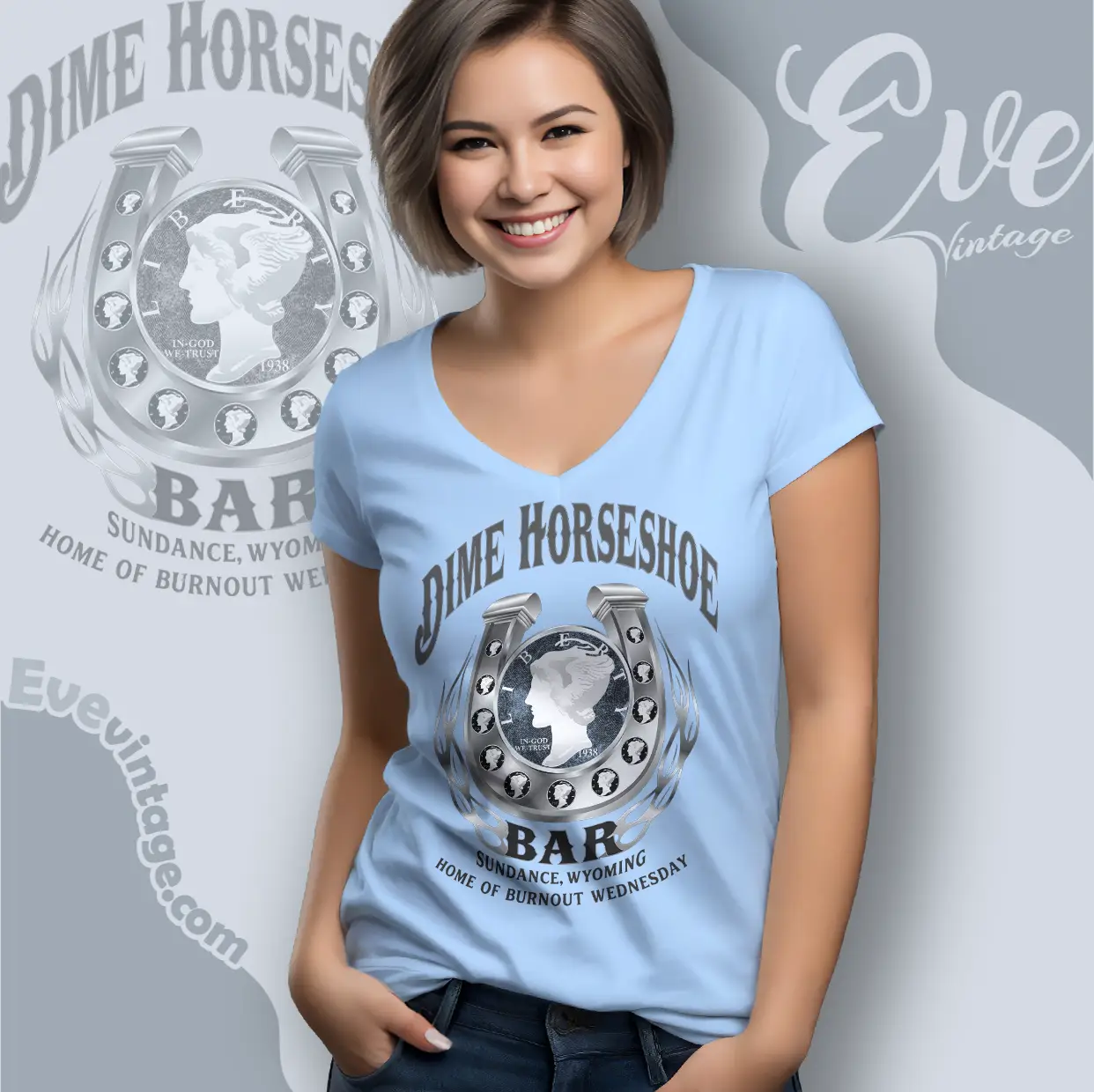The design featured on this Dime Horseshoe Bar Shirt - Sundance Wyoming Dive Bar Tee is available in multiple styles: Unisex T-shirt, Women T-shirt, Long Sleeve T-shirt, V-neck T-shirt, Unisex Pullover hoodie, Unisex Sweatshirt, Tank top. You can also buy them for all ages and genders, from Toddler, Kids, Youth, and Adults.