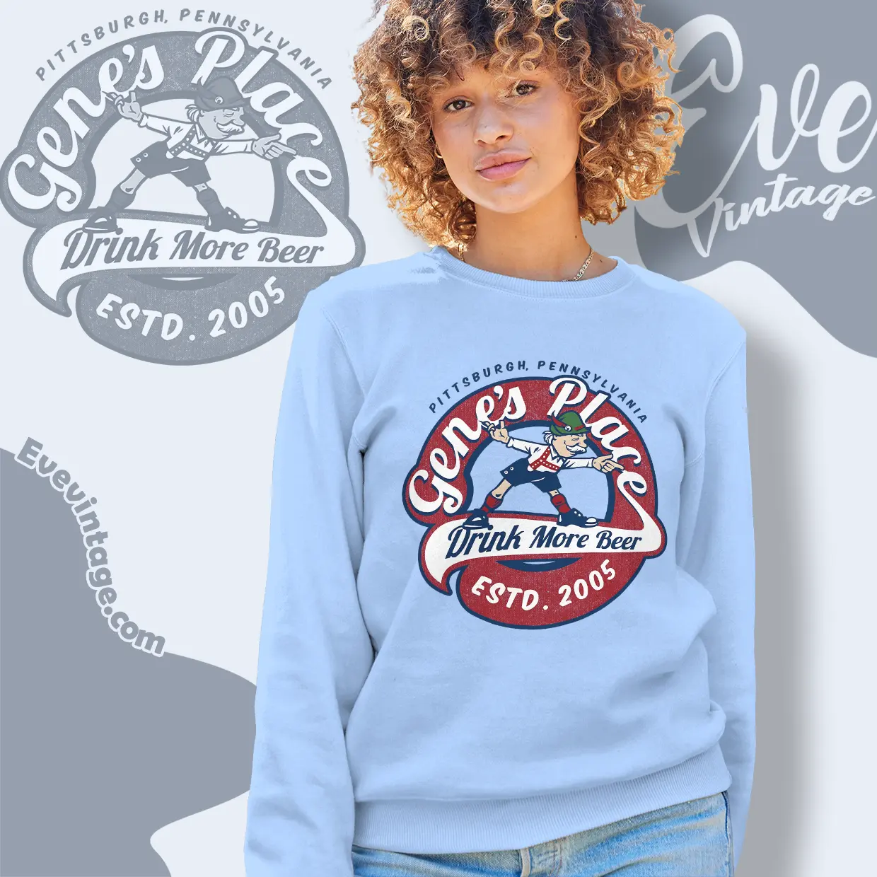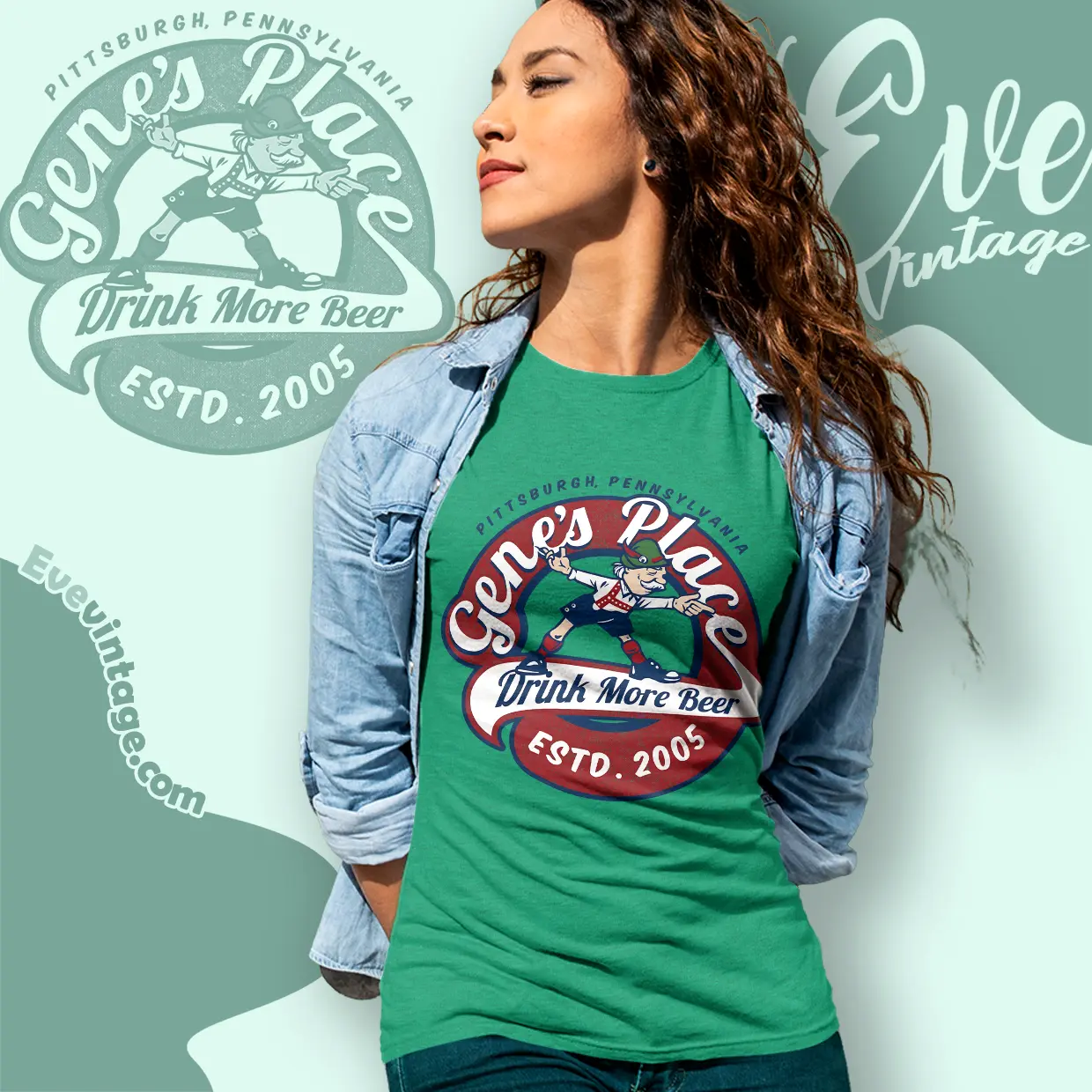 Related keywords: Gene’s Place tee, Pittsburgh dive bar shirt, Drink More Beer graphic tee, neighborhood bar apparel