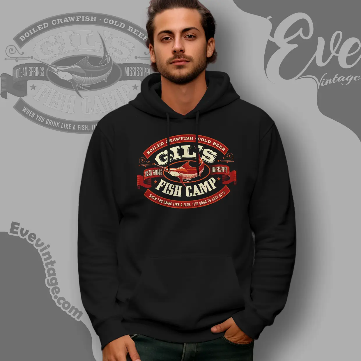 The shirt references Gil’s Fish Camp in Ocean Springs, Mississippi, a coastal town known for its laid-back seafood culture along the Gulf of Mexico. The imagery on the design highlights the staples that define many Mississippi coastal dive spots—boiled crawfish, cold beer, and fishing stories shared at the bar.