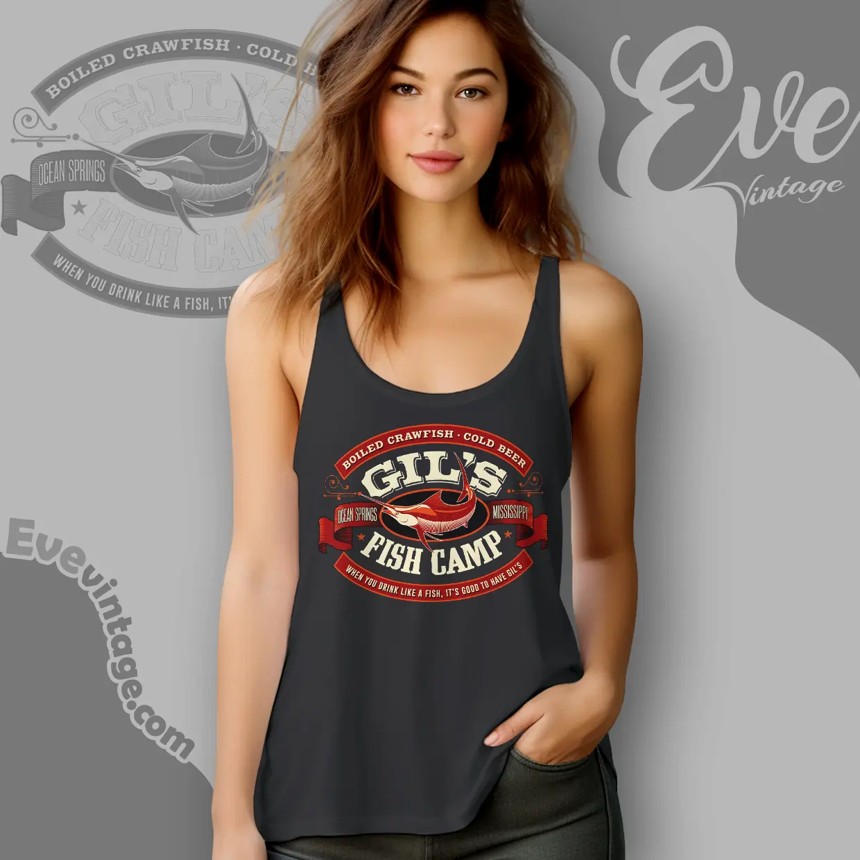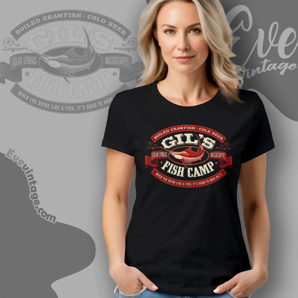 Related keywords: Gil’s Fish Camp tee, Ocean Springs Mississippi bar shirt, Gulf Coast seafood bar apparel, crawfish boil graphic tee