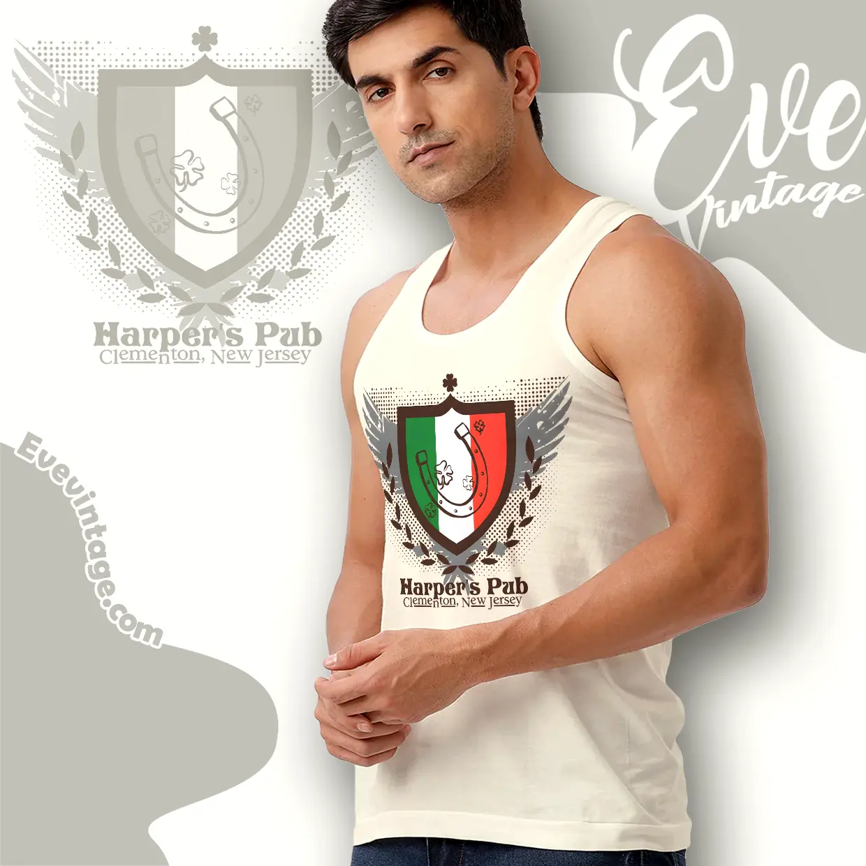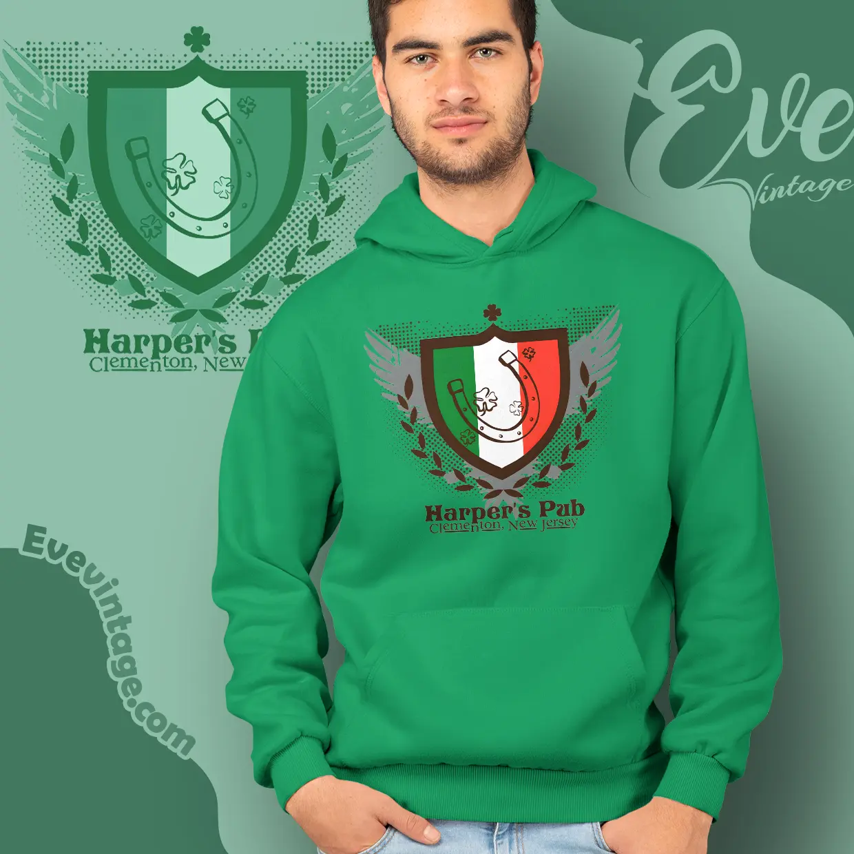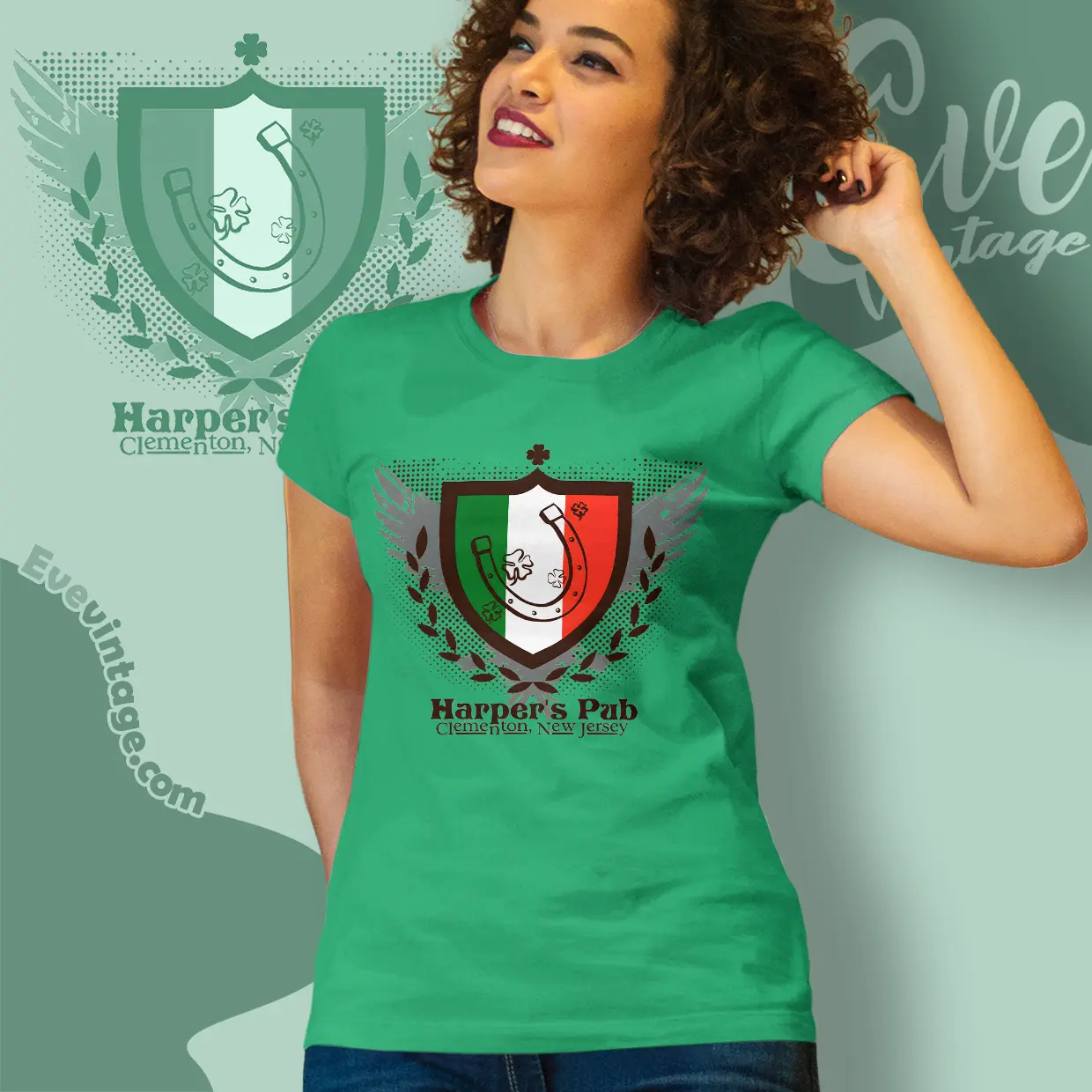 This Harper’s Pub Shirt blends classic pub symbolism with dive-bar confidence. The shield design features a horseshoe and shamrocks set against green, white, and red panels, giving the graphic an old-world, Irish-inspired feel. Anchored by “Clementon, New Jersey,” the artwork feels like a pub crest you’d expect to see hanging above a well-worn bar door.