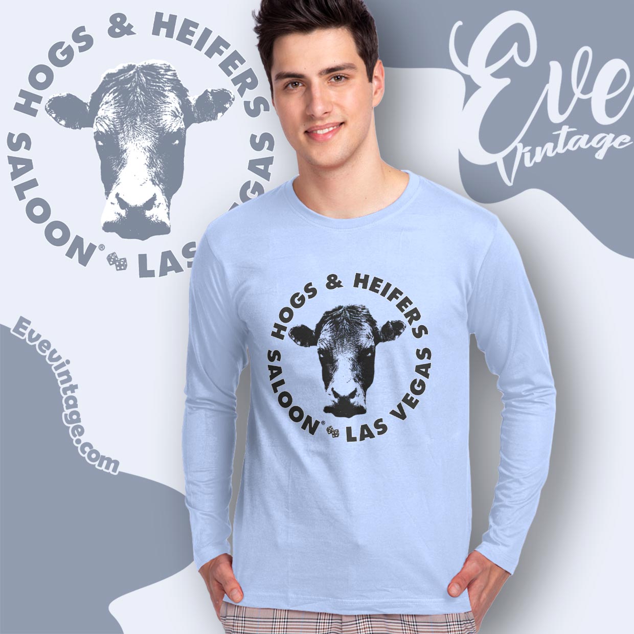 Related keywords: Hogs & Heifers tee, Las Vegas dive bar shirt, biker saloon graphic tee, rock bar apparel