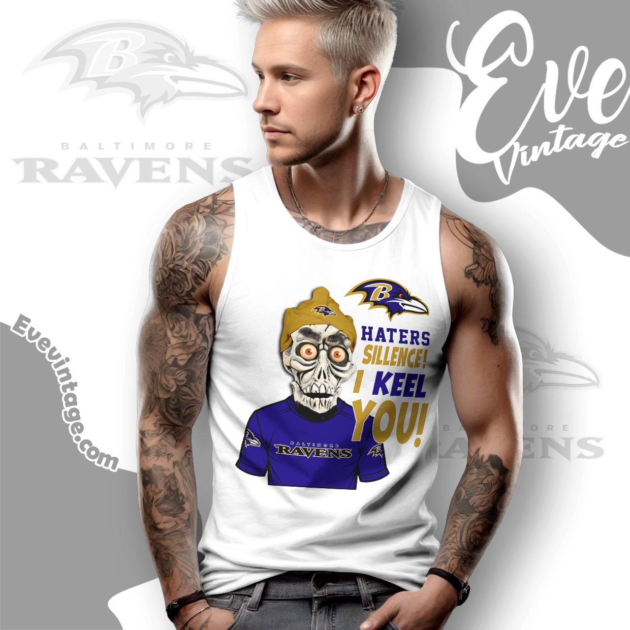 The design spotlights Achmed wearing a Ravens jersey and golden beanie with the team logo front and center. His bug-eyed stare and skeletal grin pair perfectly with the oversized phrase “Haters Silence! I Keel You!” that jumps off the design. Surrounded by Baltimore’s purple-and-gold identity, the shirt mixes fearless football spirit with laugh-out-loud comedy.
