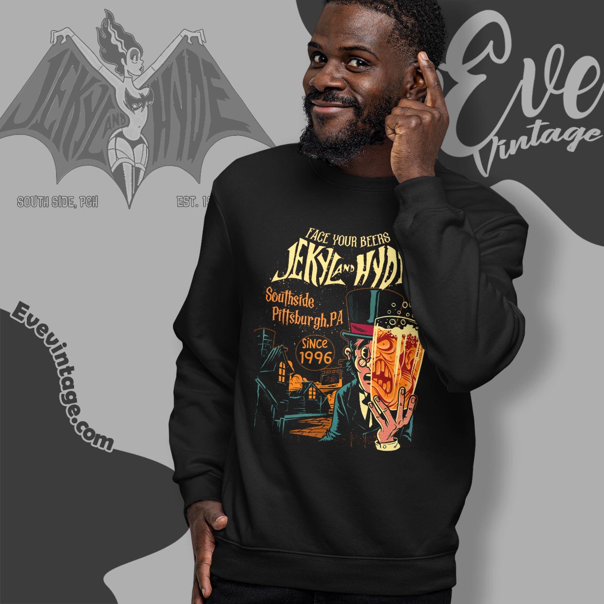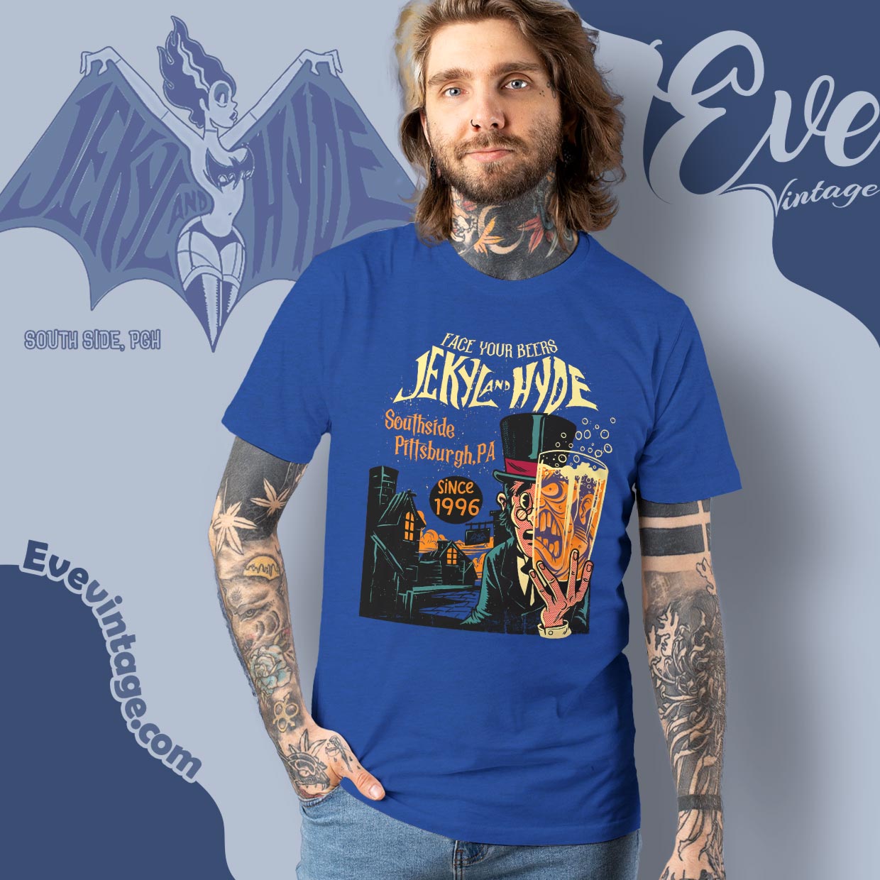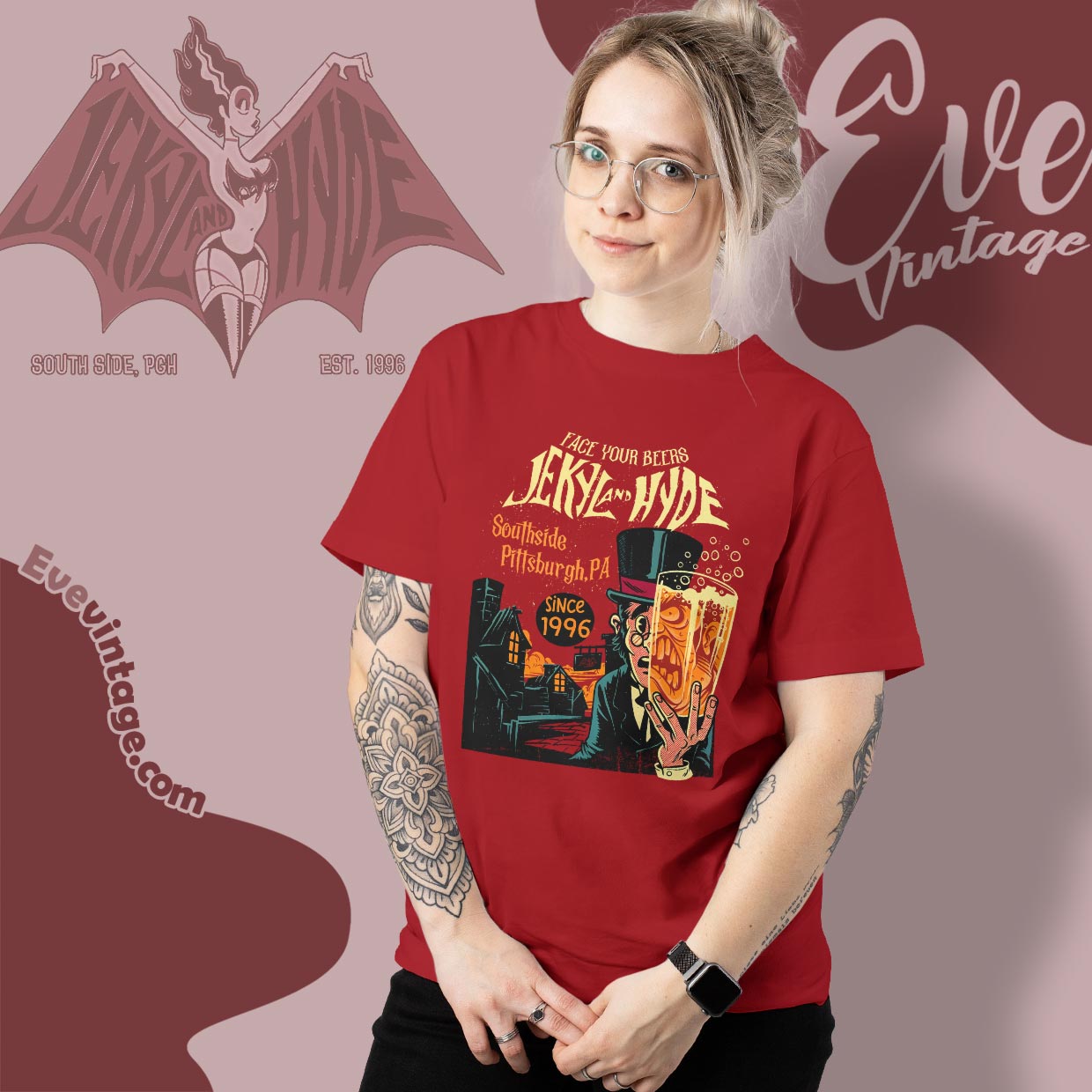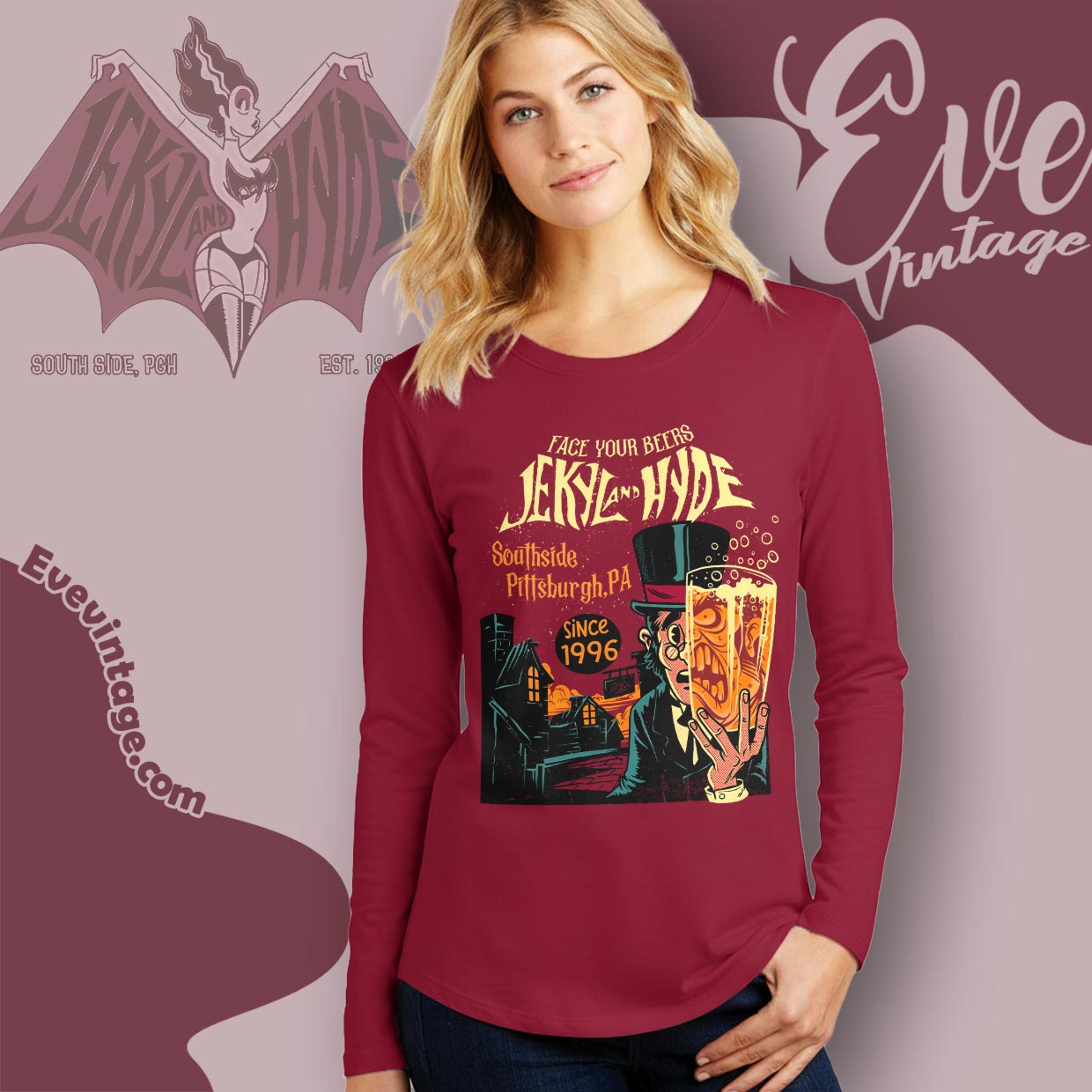The design featured on this Jekyl and Hyde Bar Shirt - Pittsburgh Dive Bar Tee is available in multiple styles: Unisex T-shirt, Women T-shirt, Long Sleeve T-shirt, V-neck T-shirt, Unisex Pullover hoodie, Unisex Sweatshirt, Tank top. You can also buy them for all ages and genders, from Toddler, Kids, Youth, and Adults.
