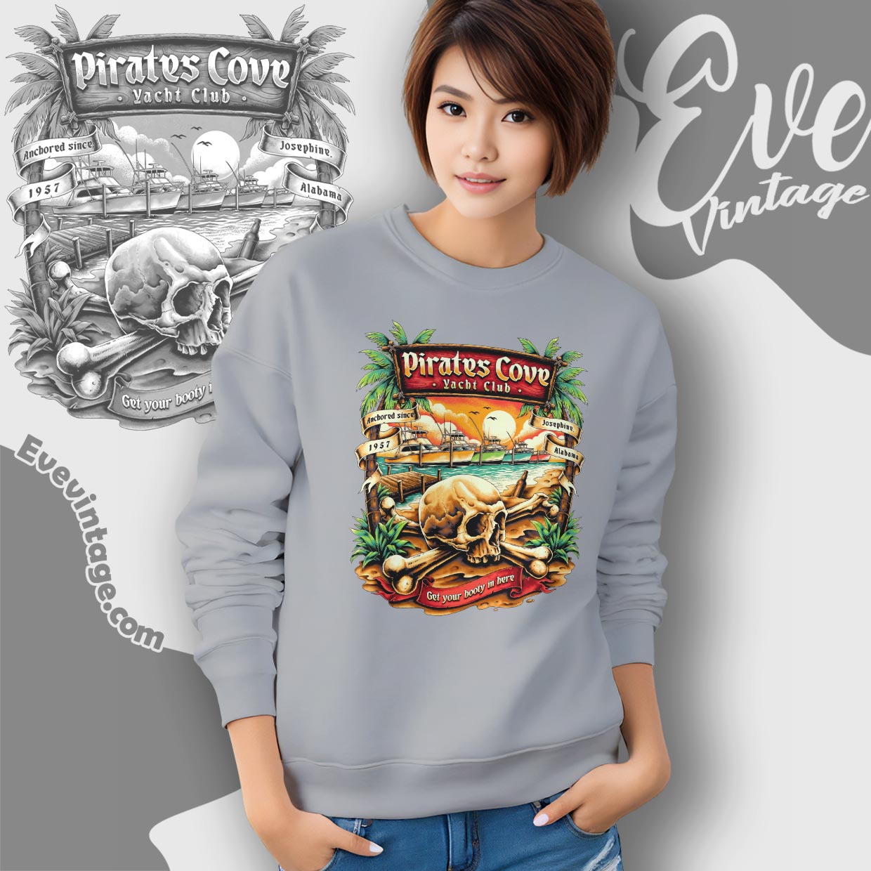 This Pirates Cove Yacht Club Shirt delivers full waterfront dive-bar energy. The artwork blends palm trees, docked boats, a setting sun, and a skull-and-crossbones centerpiece, framed by bold lettering that calls out Josephine, Alabama. With “Anchored since 1957” and a playful pirate motto, the design feels like a weathered sign pulled straight from a riverside dock.