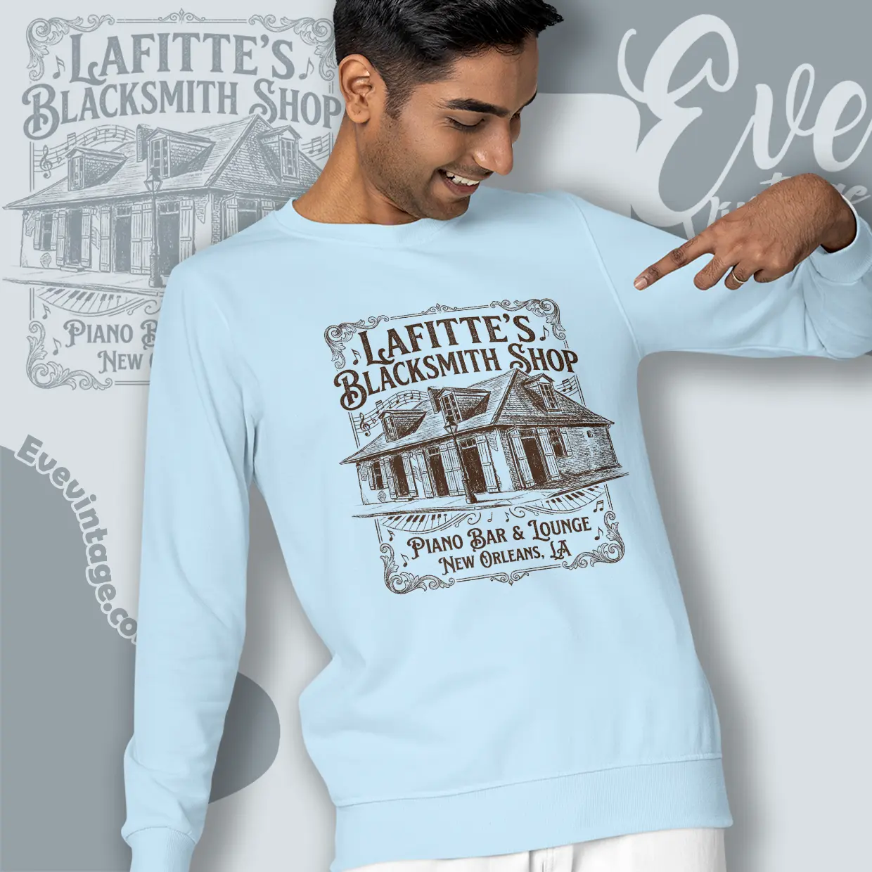 Related keywords: Lafitte’s Blacksmith Shop souvenir shirt; New Orleans French Quarter historic bar apparel; Haunted New Orleans piano bar clothing; Jean Lafitte legend t-shirt; Bourbon Street dive bar tee