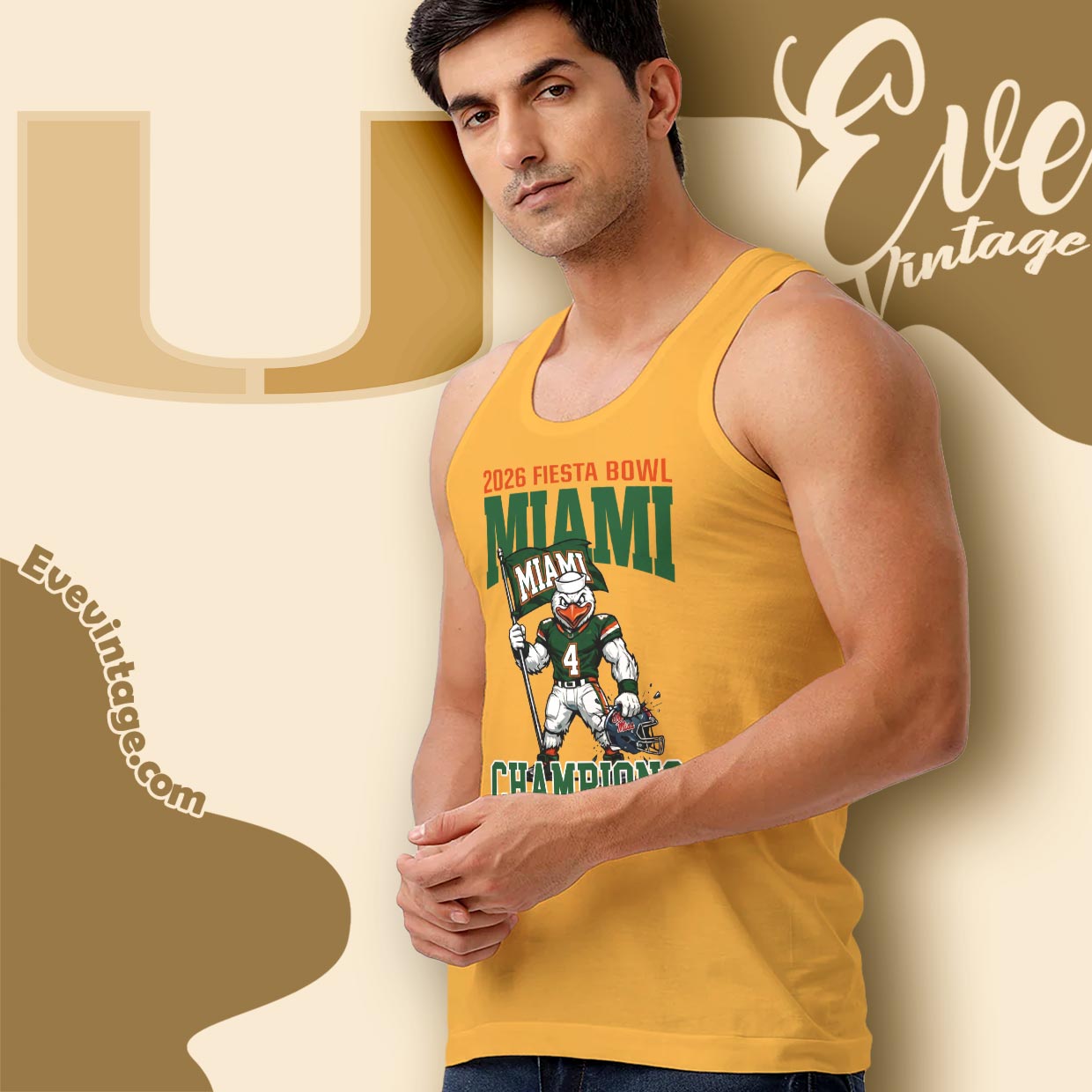 The graphic centers on Miami 2026 Fiesta Bowl Champions, combining strong collegiate typography with a powerful football-themed illustration. The green and orange color palette reinforces Miami football identity, while the championship layout keeps the focus on the bowl victory itself. Every element supports one message: Miami’s dominance at the Fiesta Bowl in 2026.