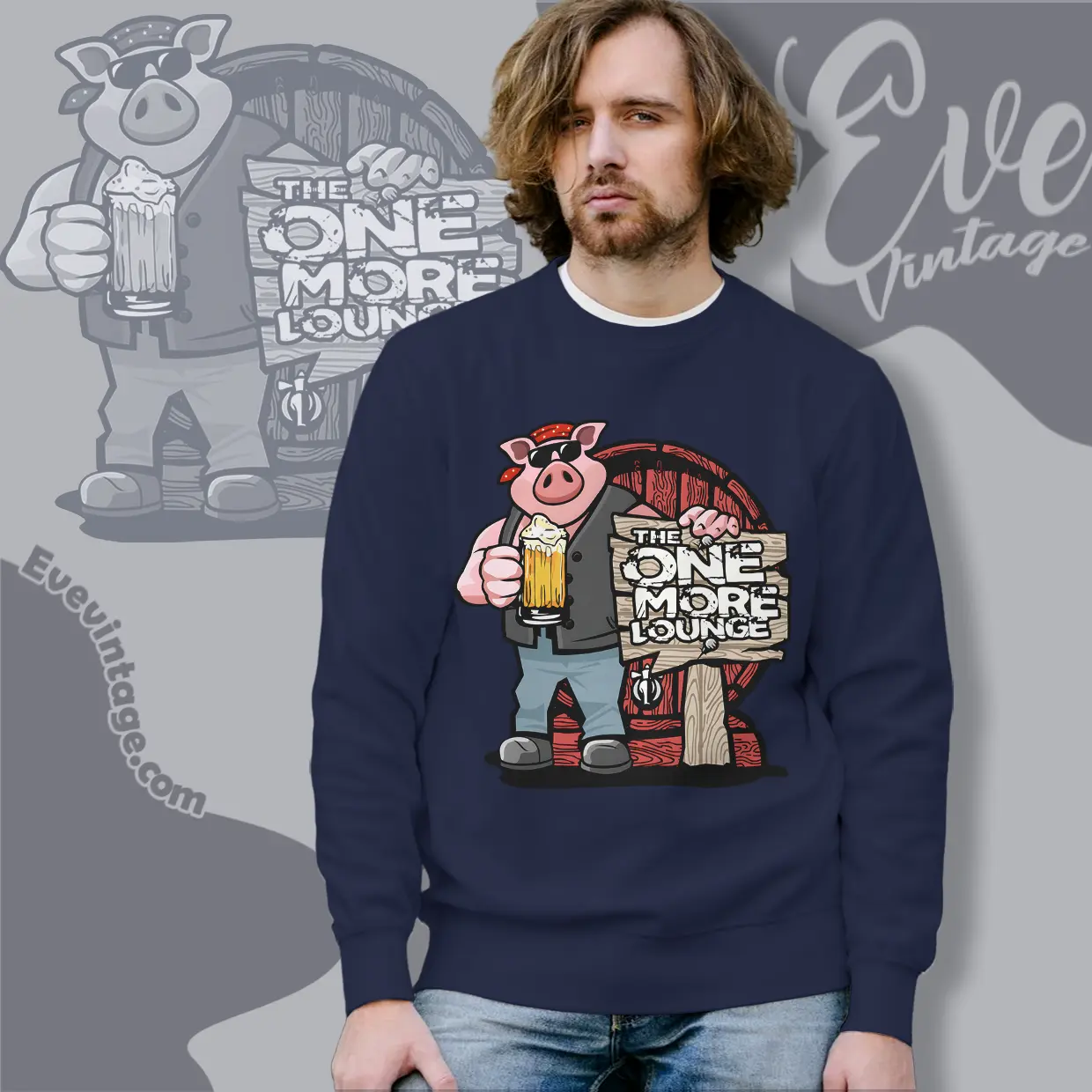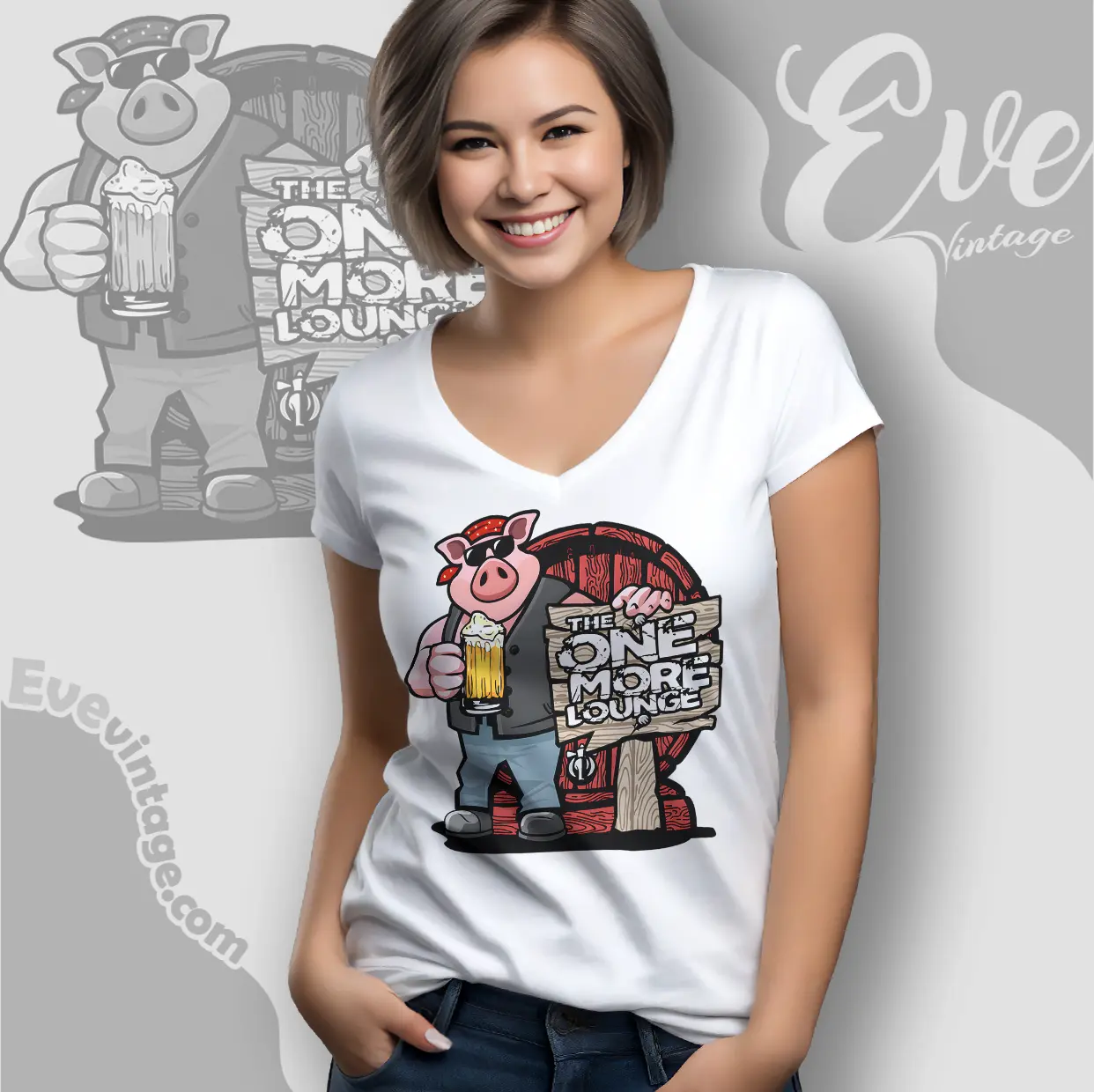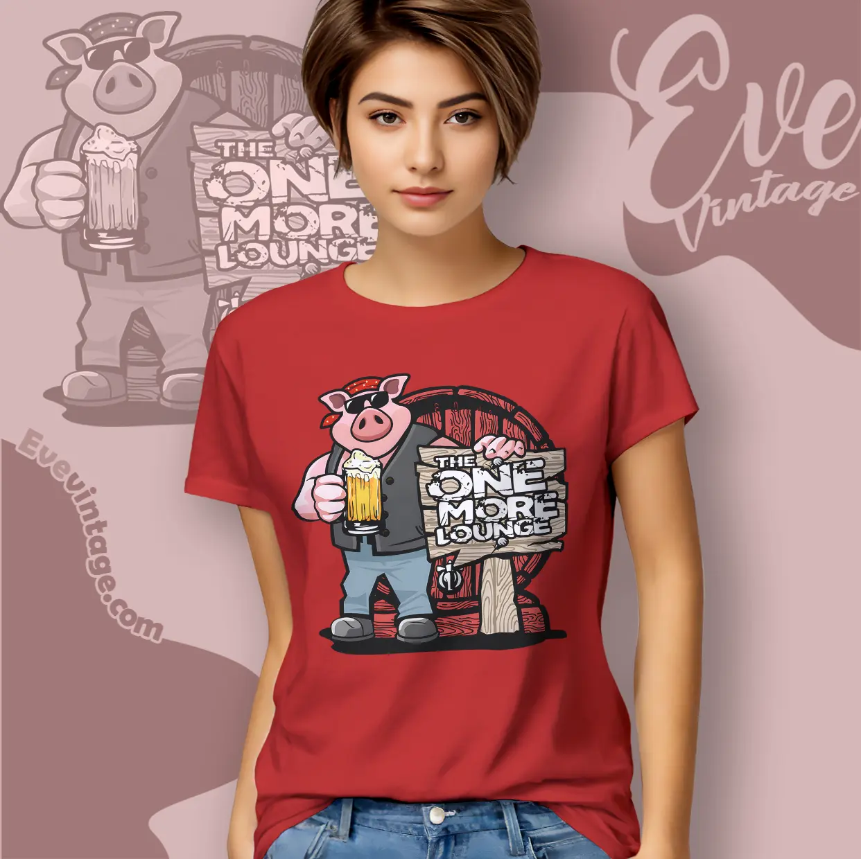 This One More Lounge Shirt leans fully into dive-bar humor. The cartoon pig gripping a frosty beer, backed by a wooden sign and barrel, gives the design a playful, rough-edged charm. Bold lettering and exaggerated character art make it feel like a bar mascot you’d recognize after your second round—lighthearted, loud, and impossible to ignore.