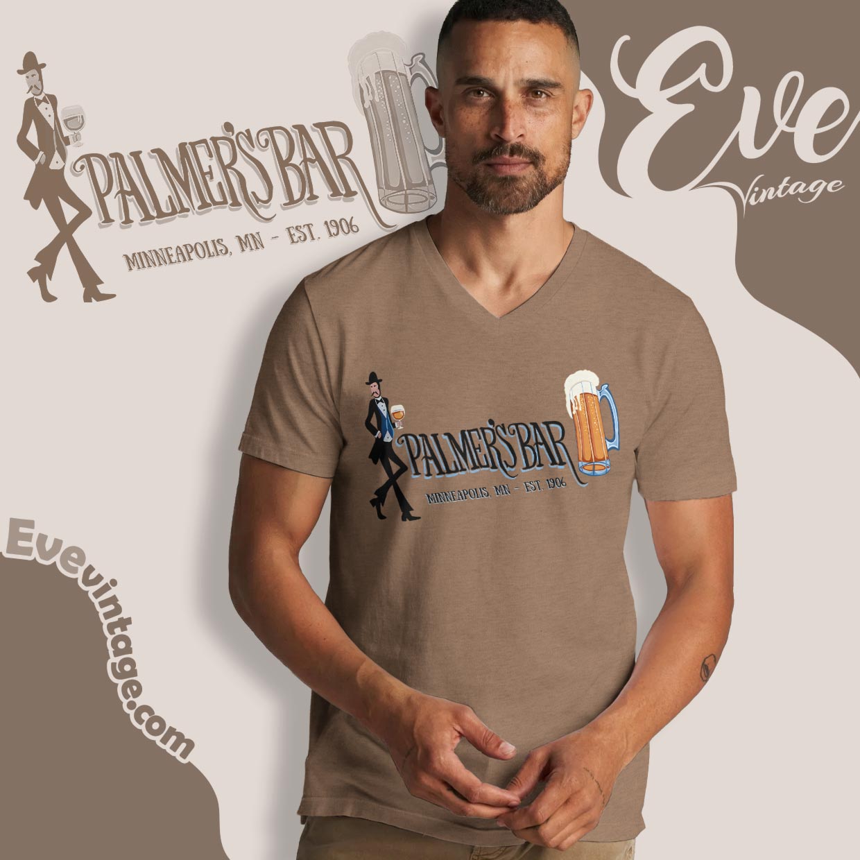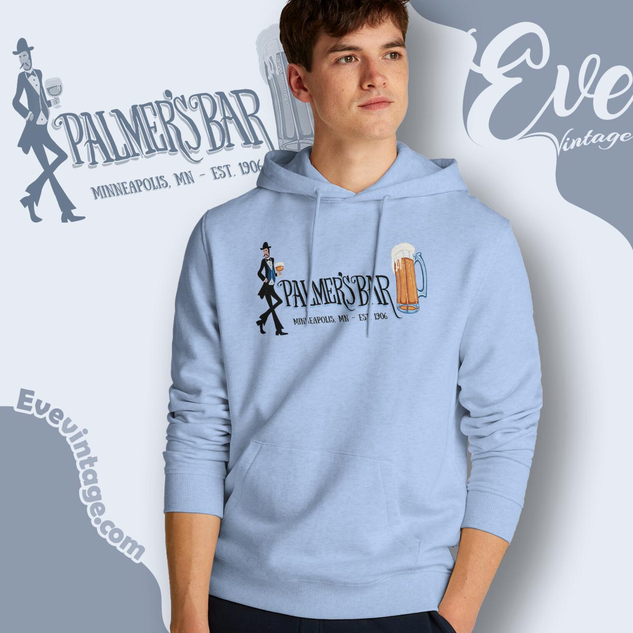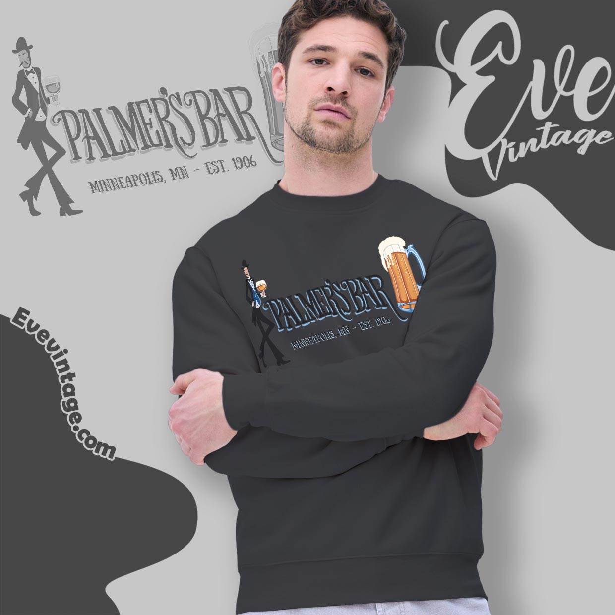 This Palmer’s Bar Shirt takes direct inspiration from the iconic mural painted on the exterior of the bar itself. The sharply dressed gentleman, oversized beer mug, and flowing vintage lettering echo the artwork that has watched over Cedar Avenue for decades. The design feels hand-crafted and timeless, like a piece of neighborhood scenery turned into wearable history—rooted in place, not fashion cycles.