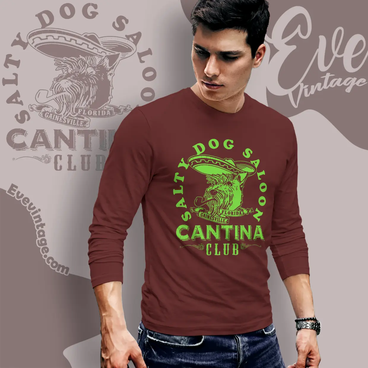 This Salty Dog Saloon Cantina Club Shirt delivers loud dive-bar personality. The snarling dog in a sombrero, neon-green ink, and bold cantina lettering give the design a gritty, tongue-in-cheek feel. With “Gainesville, Florida” worked into the graphic, the tee captures that late-night, no-rules energy that defines classic college-town bars.