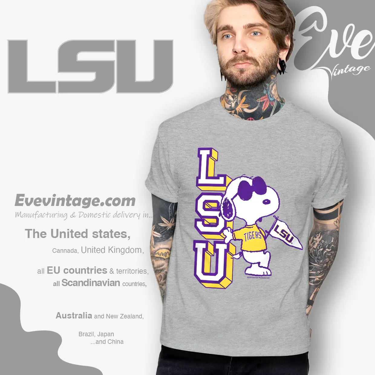 Related keywords: Snoopy Louisiana State University tee; Joe Cool Tigers fan shirt; LSU Peanuts character apparel; Purple and Gold Snoopy gameday top