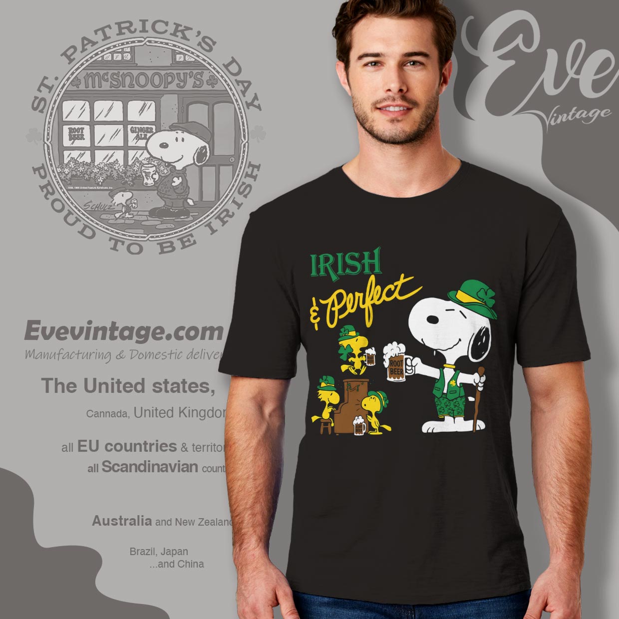The design featured on this Snoopy And Woodstock St. Patrick's Day Shirt - Irish Is Perfect is available in multiple styles: Unisex T-shirt, Women T-shirt, Long Sleeve T-shirt, V-neck T-shirt, Unisex Pullover hoodie, Unisex Sweatshirt, Tank top. You can also buy them for all ages and genders, from Toddler, Kids, Youth, and Adults.