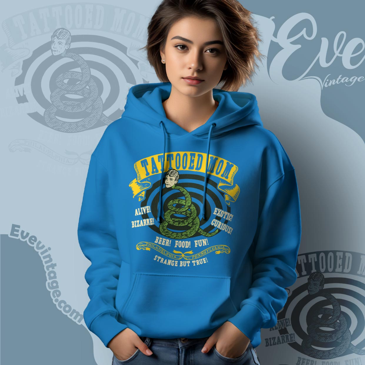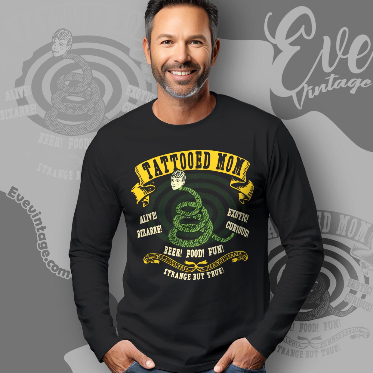 This Tattooed Mom Bar Shirt captures the raw, hand-drawn chaos that defines one of Philadelphia’s most recognizable dive bars. The hypnotic spiral, coiled snake, and bold slogans like “Alive! Bizarre!” and “Strange But True!” echo underground poster art and DIY punk flyers. It’s loud, weird, and unapologetic—exactly the kind of graphic that feels earned, not styled.