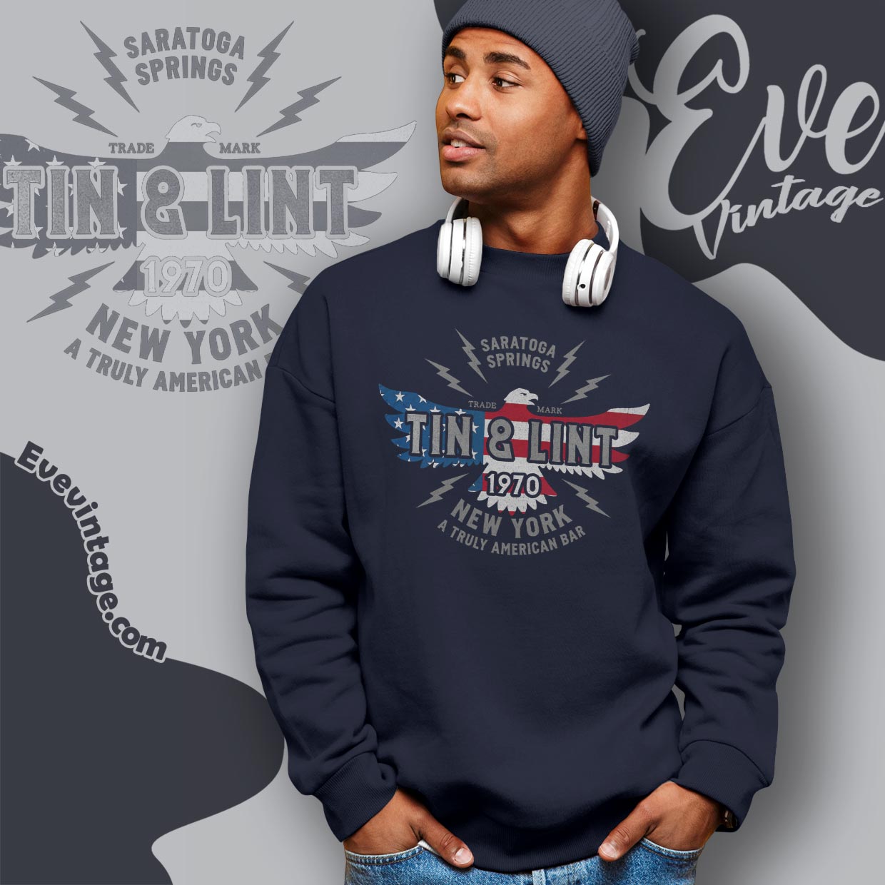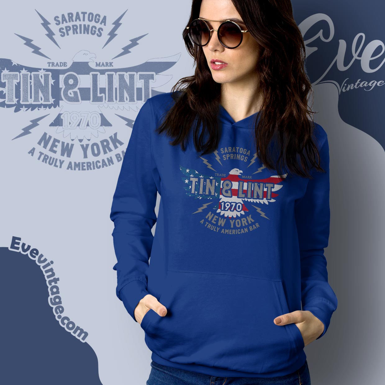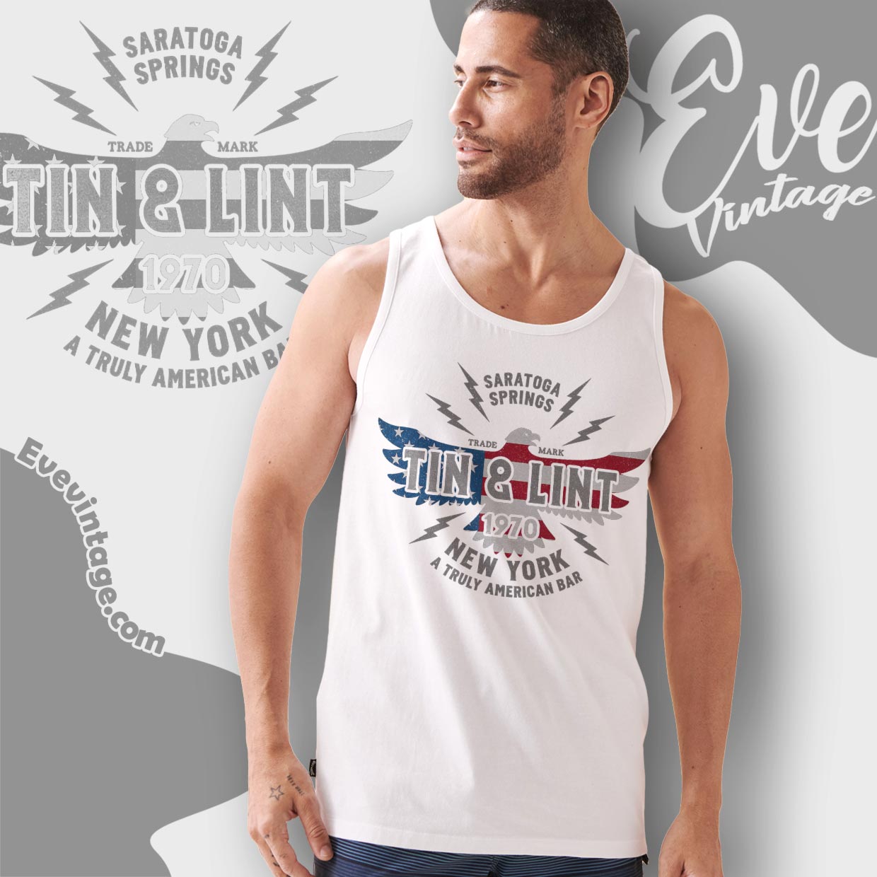 The Tin and Lint Bar Shirt captures a raw, old-school New York dive-bar identity. The bold eagle graphic filled with distressed red, white, and blue gives the design a patriotic, working-class feel, while the typography leans into a vintage union-hall aesthetic. Marked with “Saratoga Springs” and “1970,” the shirt feels like a worn bar logo passed down through decades of late nights and loud jukeboxes.