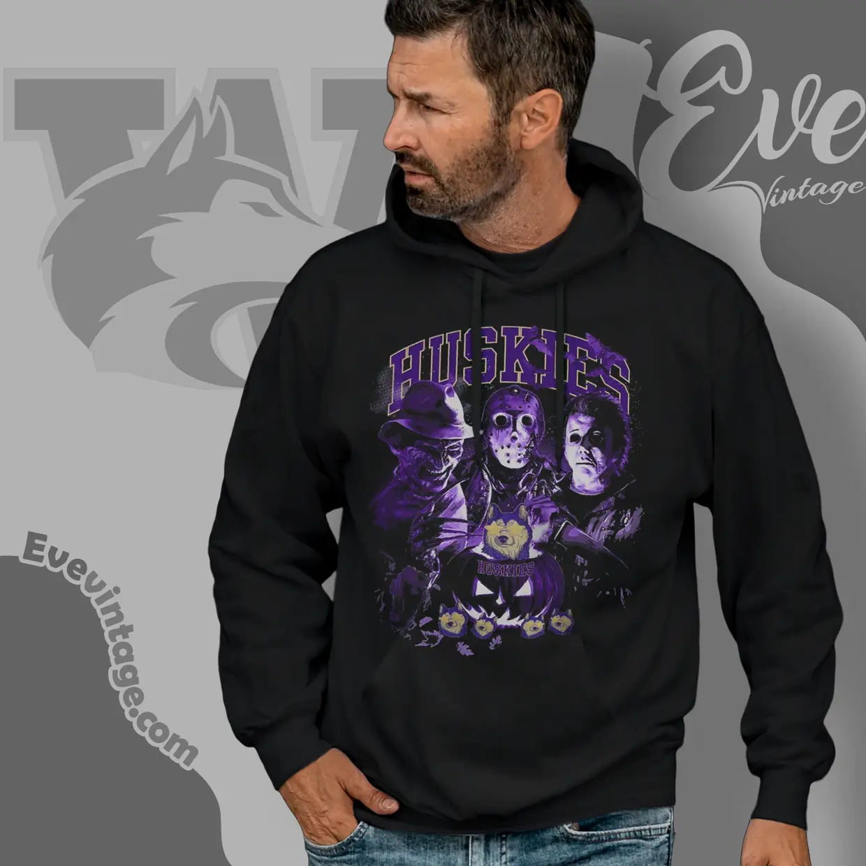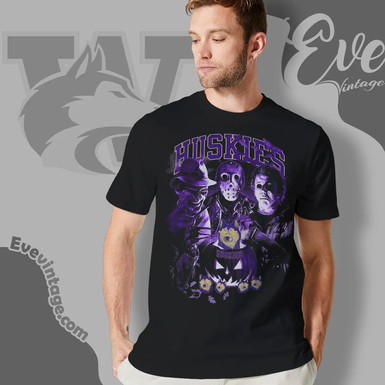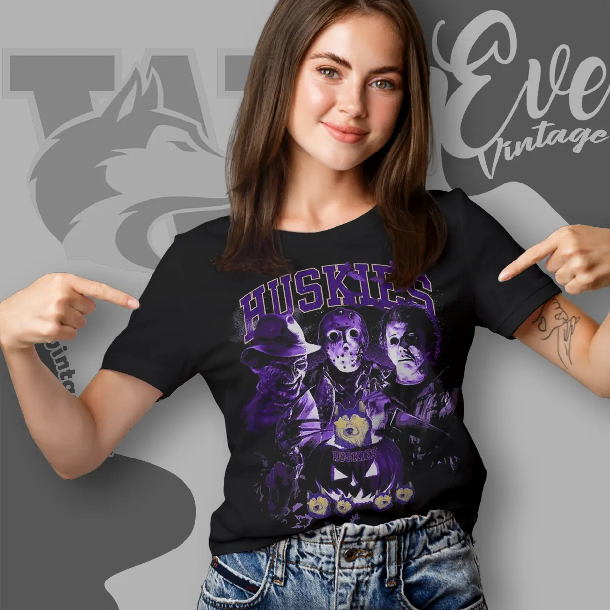 Related keywords: Washington Huskies Halloween shirt; Washington Huskies horror movie shirt; Huskies spooky season graphic tee; purple and gold Huskies Halloween fan shirt